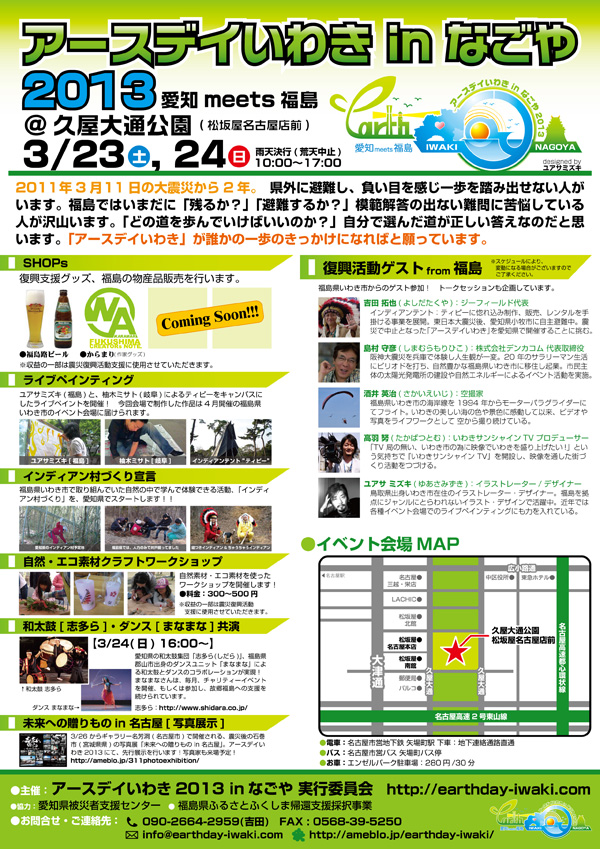 & アースデイいわき 3月のイベント情報を更新いたしました。 3/23(土)、24(日)に愛知県名古屋市で開催される「アースデイいわき2013 in なごや 〜愛知meets福島〜」イベントの情報をアップしています。同イベントではユアサミズキライブペインティング及び作品展示販売で参加させていただきます。愛知近郊の方はぜひ遊びにいらしてください。 → イベントページ また、同「アースデイいわき」のイベントロゴデザイン及び、フライヤーデザインでも携わらせていただいています(左記の内容)。こちらも合わせてご覧いただければ幸いです。 アースデイいわき公式サイト: http://earthday-iwaki.com |