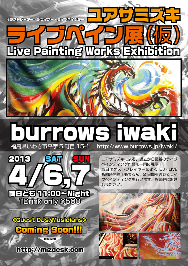 Eventsページ更新 イベントページを更新しました。来週末1/27(日)にburrows iwaki(福島県いわき市)で開催される「Bar Burrows x PARK FES」イベントの情報をアップしています。ユアサミズキ、2013年初のライブペイント出演イベントとなります。 ● Eventsページ |
