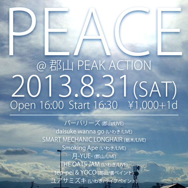 【Peace @ 郡山PEAK ACTION / ライブペイント】 イベント情報ページを更新いたしました。8/31に郡山PEAK ACTIONで開催される「Peace」のイベント情報詳細をイベントページにアップしました。ユアサミズキ初の郡山ライブハウスでのライブペイントとなります。ぜひご覧ください! → イベントページ |