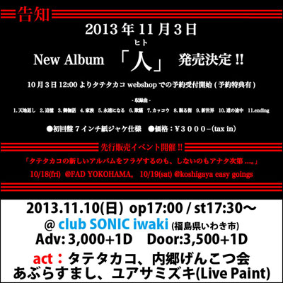 【11/1,2夜明け市場 誕生祭】 【11/10タテタカコLIVE】 イベント情報ページを更新いたしました。 11/1,2,3に開催される夜明け市場(福島県いわき市)での誕生祭、そして、11/10にclub SONIC iwaki(福島県いわき市)で開催されるタテタカコNew Album「人」リリースLIVEにて、ライブペインティングで出演させていただきます。 詳細はイベントページでチェック! → イベントページ |