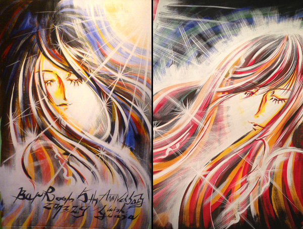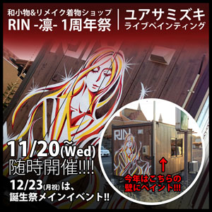 PAINTページ更新 昨年12月の後半に行ったライブペインティング作品2点を、LIVEPAINTページにアップいたしました。23日〜27日にリメイク着物shopの「RIN」さん店舗でのペイント、そして27日にclub SONIC IWAKIでのLIVEイベントでのペイントをアップしています。ぜひチェックしてみてください! ● LIVE PAINTページ |