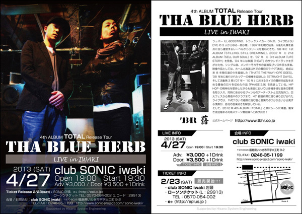 BLUE HERBフライヤー 4/27(土)にclub SONIC iwaki(福島県いわき市)で開催される、THA BLUE HERB Live in IWAKIのフライヤーを制作させていただきました。チケットは2/23からリリースされます。 ←画像のクリックで大きい画像が開きます。 4th ALBUM「TOTAL」RELEASE TOUR THA BLUE HERB LIVE in IWAKI 2013年4月27日(土) OPEN:19:00 / START:19:30 会場:club SONIC iwaki チケット 前売り:3,000円(+ドリンク500円) 当日:3,500円(+ドリンク500円) チケット発売:2013年2月23日(土)〜 ・ローソンチケット TEL:0570-084-002 (Lコード:29913) ・e+ : http://eplus.jp/ ・SONIC店頭 http://www.sonic-project.com/~sonic-iwaki/ |