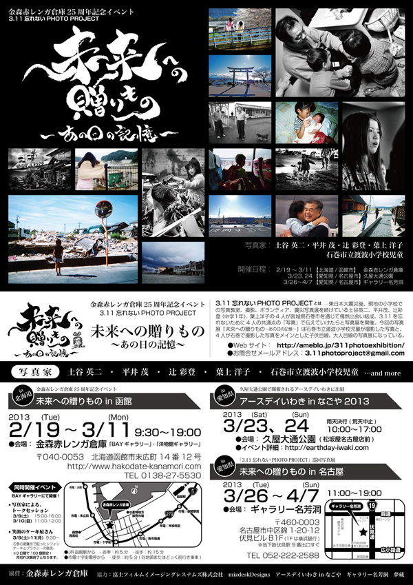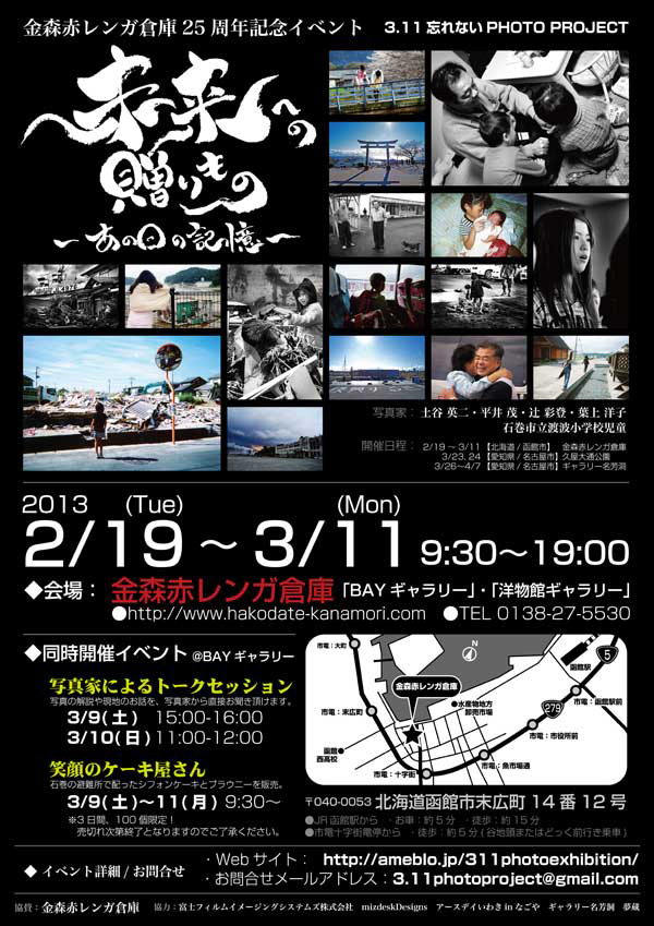 PROJECT 写真展ポスター / フライヤー 2/19(火)から、金森赤レンガ倉庫(北海道函館市)で開催されている、3.11忘れないPHOTO PROJECTによる写真展、「未来への贈りもの〜あの日の記憶〜」がスタートしています。 都内や岐阜の写真家、そして地元の小学校児童による、主に震災後の石巻市(宮城県)の写真を展示する写真展。函館市の金森赤レンガ倉庫を皮切りに、愛知県、そして関西へと巡回していくプロジェクトです。 この度、ユアサミズキ、同写真展のフライヤー及び、ポスターデザインを手掛けさせていただきました。近郊で開催の際にはぜひ足をお運びいただければ幸いです。 ーーーーーーーーーー 各種展示会へのお問合せやイベント詳細 主催:3.11忘れない PHOTO PROJECT WEB/BLOG:http://ameblo.jp/311photoexhibition/ メールアドレス:3.11photoproject@gmail.com ーーーーーーーーーー ポスターはこちら。