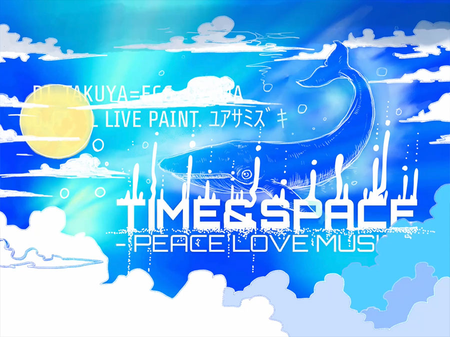 19時からスタートした今回のTIME & SPACEイベント、オープニングはDJ TAKUYA=EGG。オープン用に今回のフライヤーイメージを載せてたのですが、EGGくんのアンビエント曲も相まって、元のブルー/グリーンをベースに海や空を描きたいなぁと思って、クジラやら月やらを。