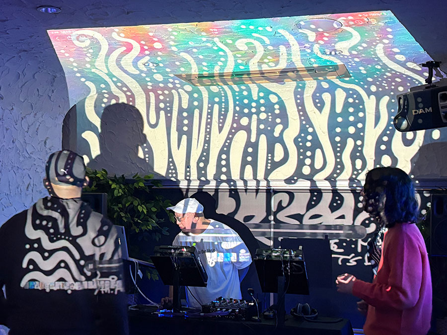 そうそう、こんな感じの空間に投射させてもらって描いていました。DJやお客さんのウェアにも映ったりして、それもまた面白かったんです。ステージの左右にスピーカーがあったり、植物が飾ってあったりして、そこは絵が映らないのでサボってたんですが、タイムラプスの映像とかだとそれも分かっちゃうので何か恥ずかしいね。