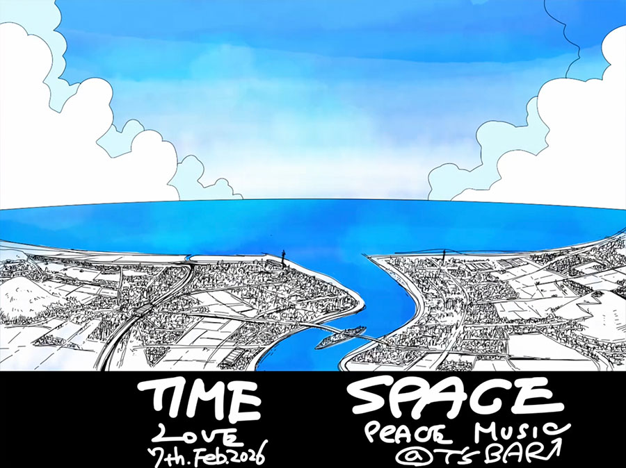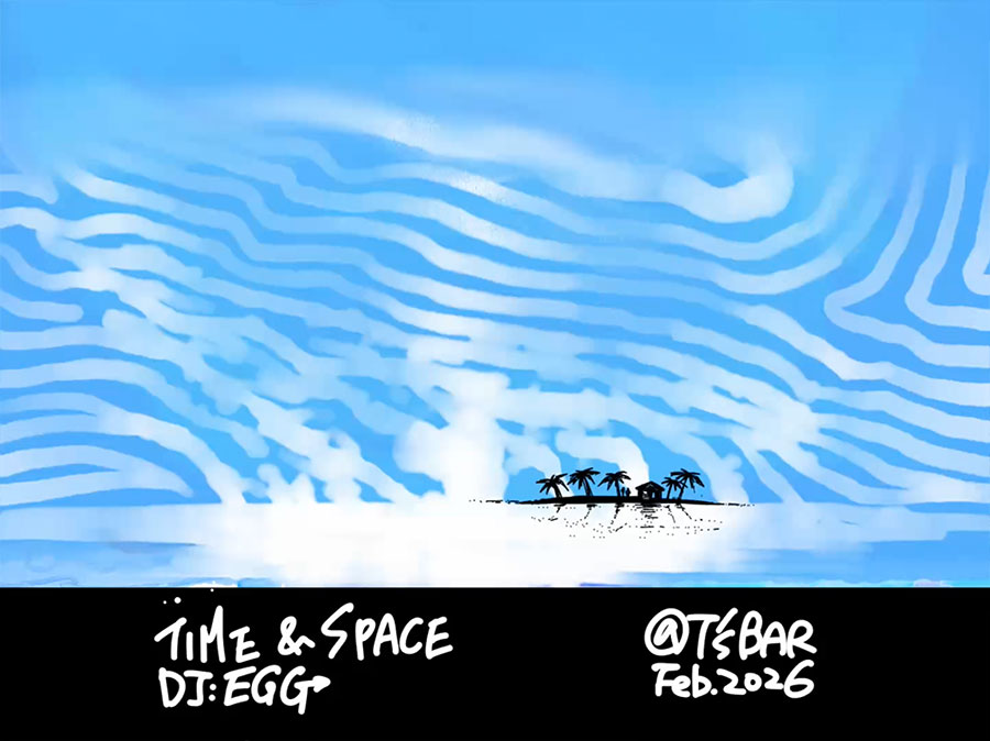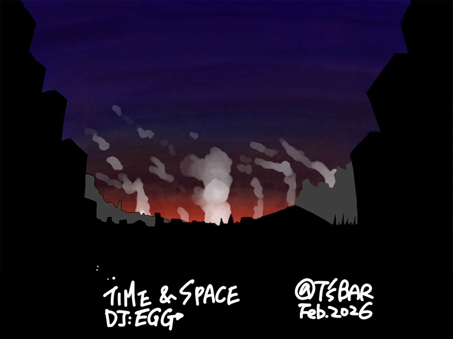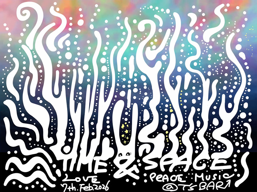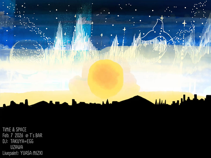 2026年2月7日に福島県いわき市のT’s BARで開催されたDJ TAKUYA=EGG主催のTIME&SPACE。DJ UZAWAも迎え8時間を超えたイベントで、ユアサミズキはデジタルライブペイントで参加しました。