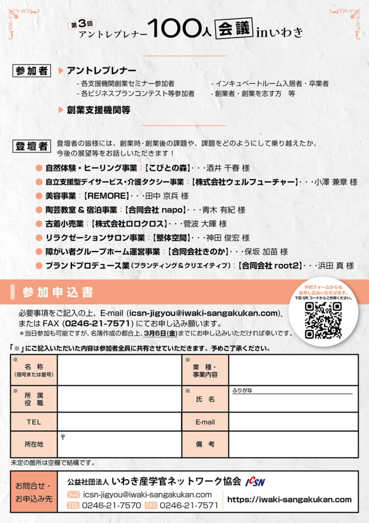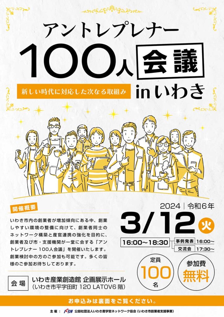 (公社)いわき産学官ネットワーク協会さん主催の、「第3回 アントレプレナー100人会議 in いわき」のフライヤーを制作。過去2回も制作させていただいたのですが、今回も従来のフォーマットを踏襲しながらカラーを変更。メインビジュアルの人々イラストの人数をさらに増やしています。