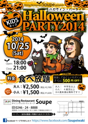 今年夏に労働福祉会館1階にオープンしたDining Restaurant Soupeさん(福島県いわき市)にて10/25(土)に開催された「キッズハロウィンパーティー」のフライヤーを制作させていただきました。