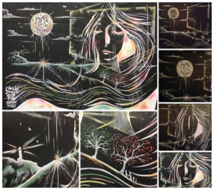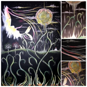 マンスリーライブとしても今年初の開催、またユアサミズキとしても本年 初のライブペイントとなりました。 後半のゲストコーナーから出演させていただき、アベマンセイ氏のプレイする3曲、おおよそ30分のペインティングをさせていただきました。今回は色々新しい試みもしてみたい気持ちで、従来のターポリン生地ではなく 黒色の模造紙をキャンバスにしています。作画はアクリル絵具とクレヨン/パステル。
