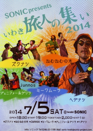 7/5にclub SONIC iwakiさん(福島県)で開催された「いわき旅人の集い2014」LIVEイベント。蒼々たるミュージシャンの皆さまと共に、ライブペイントで出演しました。本イベントでの作品をライブペイント特設ページにアップしておりますのでぜひご覧下さい。