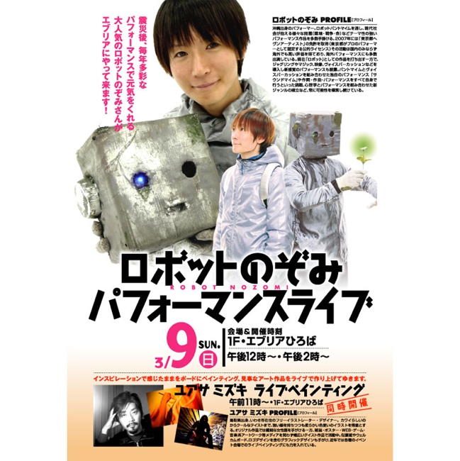 来週末の3/9(日)、鹿島ショッピングセンター エブリアさん1Fイベントホールにて、パフォーマー ロボットのぞみさんとのコラボレーションイベントが決定しました。
