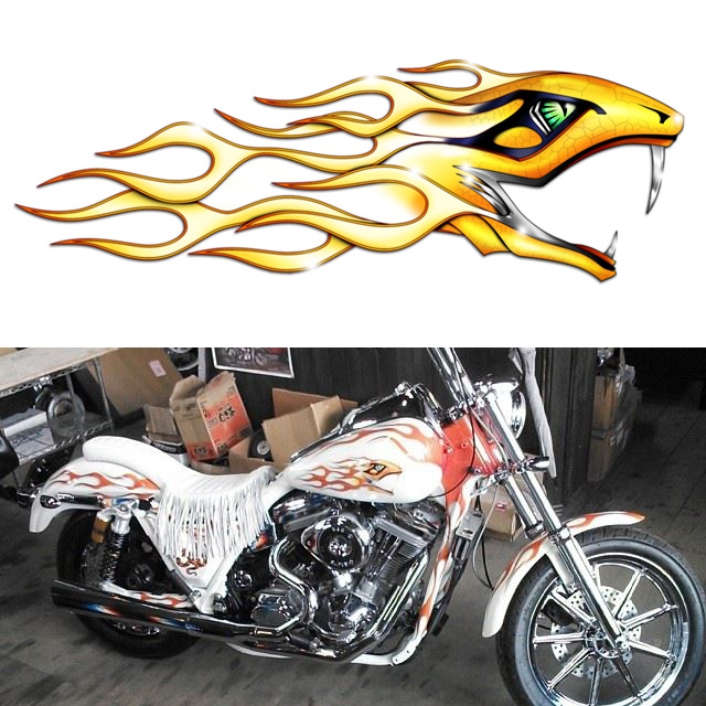 ヘビの頭とフレイムス(後ろに伸びる炎)を融合させたデザインを…という事で、艶かしさを出して欲しいというリクエストをいただき、ベースの線画はIllustratorで作画しながら、最終的な着色や加工はPhotoshopを用いてフィニッシュさせています。
