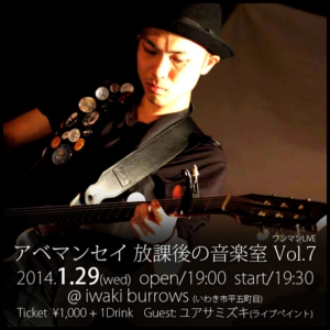 2014年 ユアサミズキ最初のライブペイント出演イベントが決定です。 いわき市を代表するギタリスト アベマンセイ氏の月イチ ワンマンLIVE企画「放課後の音楽室」。いわき市の沿岸部の空撮映像を作品化した「かもめの視線」の音楽担当もしているアベマンセイ氏、昨年からスタートしたLIVE企画のVol.7に ゲストとしてライブペイントにて参加させていただきます。