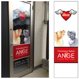 内郷高坂町(福島県いわき市)のトリミングサロン、「Trimming Salon ANGE(アンジュ)」様の店頭ドア向けの看板を制作させていただきました。元々お店さんの方で制作されていたロゴデザインをアレンジしつつ、柔らかいタッチで描いた看板犬のモコちゃんひなちゃんと共にデザインさせていただきました!!