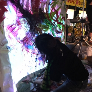 平七夕まつりの3daysの2日目、平一町目(福島県いわき市)で開催された一町目ゆかた祭にて、バンド「十中八九」として出演。ユアサミズキもライブペインティングとして出演しました。屋外でのライブペインティングは久しぶり。和紙&シートをキャンバスとして、背面からプロジェクターで映像を流しながらのペインティングとなりました。