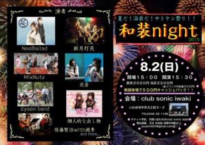 ユアサミズキ名義個人としては久しぶりのライブペイント出演が決まりました。もう直前なのですが今週末8/2(日) club SONIC iwakiさん(福島県いわき市)で開催される「和装night2015」に出演!! ぜひお気軽に遊びにいらしてください! 和装でご来場のお客様には500円ディスカウントもあります♪