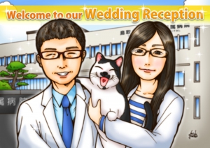 5月の前半に結婚式を挙げられた新郎新婦さまの似顔絵ウェルカムボードイラストを描かせていただきました。(今回Webでのご紹介に際してお名前と日付は非公開にさせていただいています)。お二人の職場をバックに、愛して止まない猫ちゃんと共に描かせていただきました!