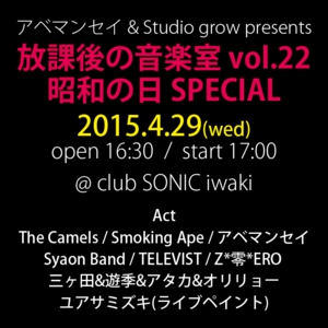 4/29(水)昭和の日、club SONIC iwaki(福島県いわき市)で開催の、アベマンセイ&Studio grow presents【放課後の音楽室vol.22 昭和の日SPECIAL】に、ユアサミズキ、ライブペインティングで出演。全7組のミュージシャンが出演!詳細はイベントページをチェック