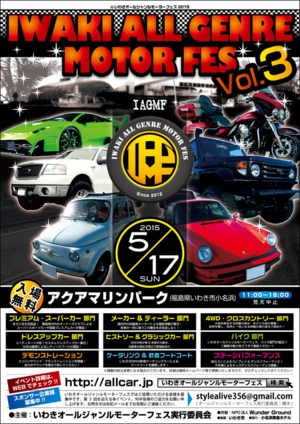 いわき市内最大規模のクルマの祭典「いわきオールジャンルモーターフェス」!!昨年のvol.2リベンジに引き続き、今年2015年のVol.3 ポスター/フライヤーのデザインを手掛けさせていただきました。